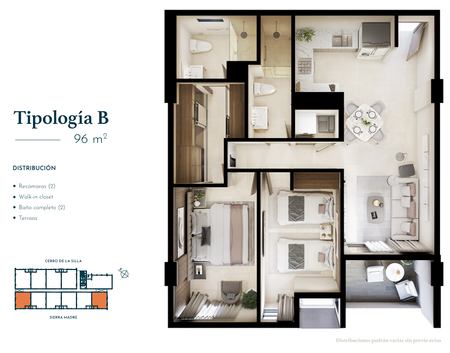 Tipo B - 96 m2 de 2 rec 2 baños 2 est desde $6,315,000
